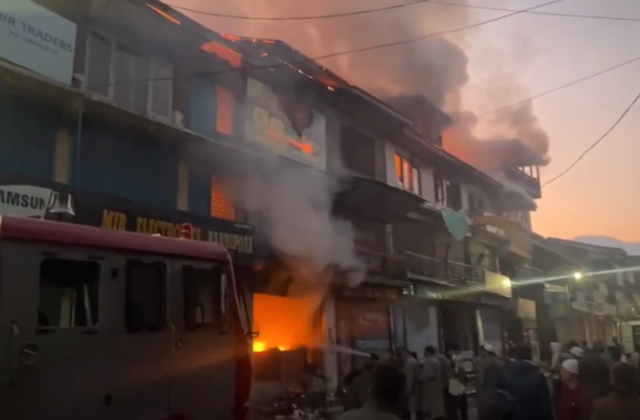बांदीपुरा ( मीर आफताब ) : अभी श्रीनगर में कपास की फैक्टरी में लगी भीषण आग अभी ठंडी नहीं हुई है कि ऐसी ही एक भीषण आग की घटना बांदीपुरा से सामने आ रही है। बताया जा रहा है कि यहां पर बांदीपुरा के मेन मार्केट में भीषण आग लगी है, जिसें तीन मंजिला कमर्शियल कॉम्प्लेक्स में बनी करीब 15 दुकानें जलकर खाक हो गईं और व्यापारियों को भारी नुकसान हुआ।