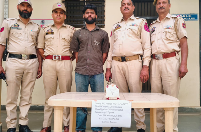 जम्मू ( तनवीर ) : नशीले पदार्थों के खतरे के खिलाफ अपनी मुहिम जारी रखते हुए, PS सिटी ने जम्मू नगर निगम के गेट के पास नाका चेकिंग के दौरान एक स्कूटी सवार से 11.71 ग्राम हेरोइन जैसा पदार्थ बरामद किया और उसे स्कूटी (रजिस्ट्रेशन नंबर JK02CD/4577) के साथ गिरफ्तार कर लिया। स्कूटी सवार ने मौके से भागने की कोशिश की, लेकिन कड़ी मशक्कत के बाद उसे सूझबूझ से पकड़ लिया गया।