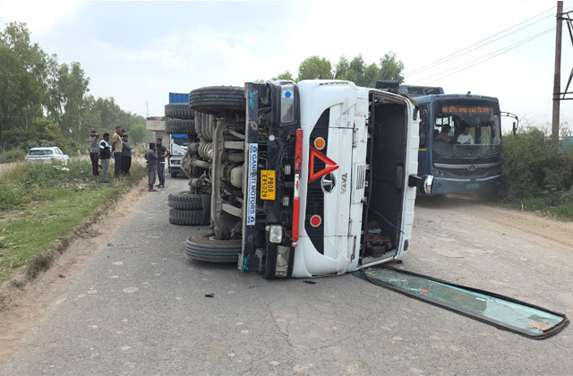 कठुआ ( लोकेश ) : कठुआ के राजबाग क्षेत्र अंतर्गत सकते चक इलाके में उस समय अफरा-तफरी मच गई जब कठुआ से जम्मू की ओर जा रहा एक ट्रक अचानक अनियंत्रित होकर सड़क के बीचों-बीच पलट गया। हादसे के चलते कुछ समय के लिए मार्ग पर यातायात भी प्रभावित रहा। प्रत्यक्षदर्शियों के अनुसार, ट्रक अचानक संतुलन खो बैठा और पलट गया। हादसे के दौरान पीछे आ रहे एक अन्य ट्रक चालक ने बताया कि दुर्घटनाग्रस्त ट्रक का चालक पूरी तरह सुरक्षित है और उसे केवल मामूली चोटें आई हैं।