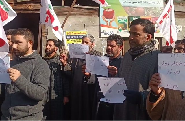 सेब किसानों ने प्रस्तावित रेलवे प्रोजेक्ट के खिलाफ कीगाम में विरोध प्रदर्शन करते हुए नारे लगाए। किसानों ने कहा कि प्रस्तावित रेलवे लाइन उपजाऊ सेब के बागों से होकर गुजरेगी और उनकी कमाई के एकमात्र सोर्स को भारी नुकसान पहुंचाएगी।