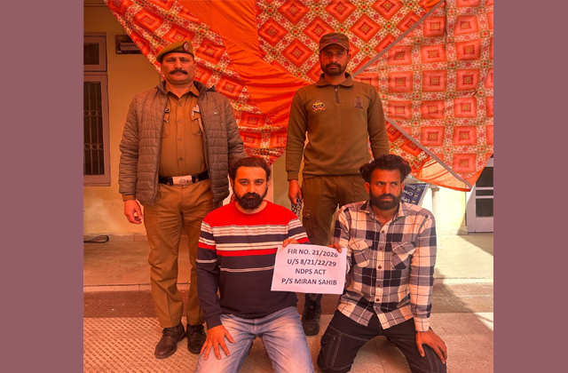 SDPO आर डी पुरा और SP हेडक्वार्टर जम्मू के सुपरविजन में SHO P/S मीरां साहिब, इंस्पेक्टर जतिंदर सिंह की लीडरशिप में पुलिस स्टेशन मीरां साहिब की एक पुलिस टीम ने अंडरपास रिंग रोड के पास नाका लगाया और चेकिंग/फ्रिस्किंग के दौरान दो ड्रग पेडलर्स को गिरफ्तार किया, जिनके नाम अनिल चौधरी पुत्र अज़ेल चंद निवासी नारी मीरान साहिब और 2. आकाशजोत सिंह पुत्र प्रभजोत सिंह निवासी वार्ड नंबर 10 मिल एरिया आरएस पुरा और *उनके पास से क्रमशः 11.84 ग्राम हेरोइन पॉलीथीन के साथ और 9.55 ग्राम हेरोइन बिना पॉलीथीन के बरामद हुई*।