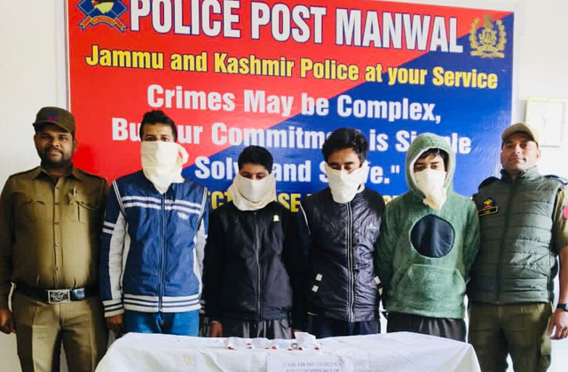 उन्होंने एक पंच कार जिसका रजिस्ट्रेशन नंबर JK02DP-9627 था और एक बुलेट मोटरसाइकिल जिसका रजिस्ट्रेशन नंबर JK02CQ-7326 था, को रोका। तलाशी के दौरान, आरोपियों के पास से लगभग 8 ग्राम हेरोइन जैसा पदार्थ बरामद हुआ आरोपियों की पहचान रोहित जामवाल पुत्र शमशेर सिंह, निवासी जिंद्राह, 2.11 ग्राम 2. अभिषेक जामवाल पुत्र बृज पाल, निवासी जिंद्राह, 1.55 ग्राम। 3.अरविंद सिंह उर्फ काका पुत्र सत पाल, निवासी जिंद्राह, 2.23 ग्राम। 4.आदित्य सिंह उर्फ वीरू पुत्र ओमकार सिंह, निवासी जिंद्राह, 2.23 ग्राम के तौर पर हुई है।
