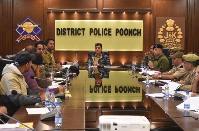पुंछ ( धनुज शर्मा ) : पुंछ में वरिष्ठ पुलिस अधीक्षक (SSP) पुंछ, शफकत हुसैन (JKPS) द्वारा एक व्यापक अपराध और सुरक्षा समीक्षा बैठक आयोजित की गई। इस बैठक का उद्देश्य जिले भर में मौजूदा कानून-व्यवस्था की स्थिति का आकलन करना, चल रही जांचों की समीक्षा करना और पुलिस व्यवस्था को मज़बूत करने के लिए रणनीतियां तैयार करना था। इस बैठक में DySP मुख्यालय पुंछ, SDPO मेंढर, ज़िले के अन्य वरिष्ठ अधिकारियों और सभी थाना प्रभारियों (SHOs) ने भाग लिया।