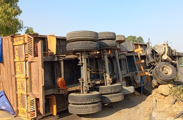 सांबा (अजय) : जम्मू-पठानकोट राष्ट्रीय राजमार्ग पर सांबा के महेश्वर में पंजाब से गेहूं लेकर आ रहा ट्रक सड़क के बीचों-बीच पलट गया। हालांकि हादसे में चालक पूरी तरह से सुरक्षित बच गया। जानकारी अनुसार गेहूं से लोड ट्रक जब सांबा के महेश्वर में पहुंचा तो एक खड्डे से बचने के चक्कर में चालक का ट्रक पर नियंत्रण में नहीं रहा और वहां पर पलट गया। हादसे में चालक बच गया, लेकिन सारा गेहूं सड़क के बीचों-बीच गिर गया। इससे एक तरफ का यातायात बंद रहा। वहीं पुलिस ने मामला दर्ज करके कार्रवाई शुरू कर दी ।