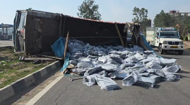 कठुआ (लोकेश): जम्मू-पठानकोट राष्ट्रीय राजमार्ग पर आज एक बड़ा सड़क हादसा हो गया। मगर खड्ड के पास चल रहा एक ट्रक अचानक संतुलन बिगड़ने से बीच सड़क पर पलट गया। हादसे में ट्रक को काफी नुकसान पहुंचा, लेकिन राहत की बात यह रही कि चालक को केवल हल्की चोटें आईं और कोई बड़ा जानी नुकसान नहीं हुआ।